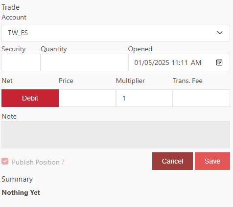Here is the securities screen. By default, it shows either the portfolio you have selected in the main portfolio drop down, or if you’ve selected All there, it’ll choose the last selected portfolio. Simply typing in the security, its quantity, the price, and multiplier are all that's required. The opened date and time is defaulted to the current date and time. The ‘Trans. Fee’ is the total transaction fee and is optional. I decide to not enter this in for speed of entry, and instead use my brokers fee total, but you are welcome to use it.