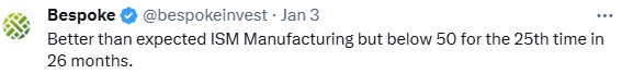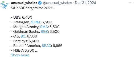 Banana and a couple firms throw their hat into the ring for 2025 predictions. Last letter I said I was guessing around 15% +- 2%. Jan 2nd opened at, 5891 * 1.15 = 6,775. This would put me near the top of these guesses, but not the highest.