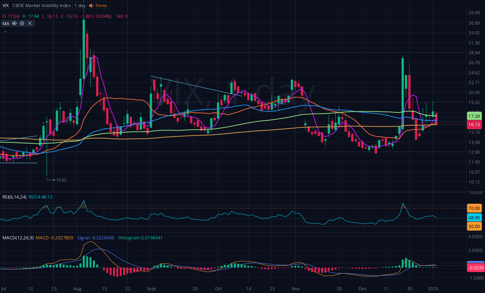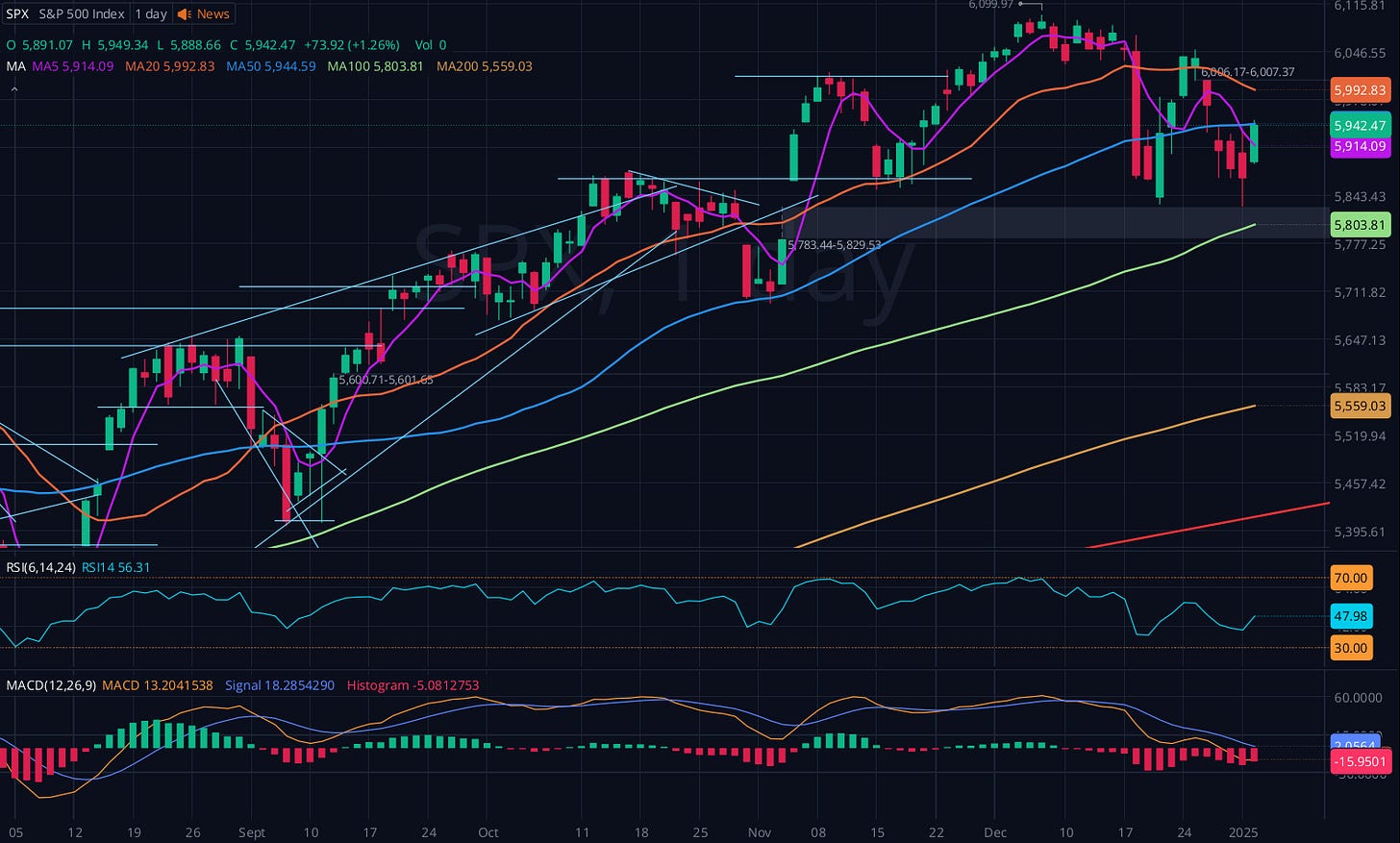 SPX spent four of the five days this week trending down, but critically, we bounced on the 20 week, previous resistance, at 5865. We ended the week down .5 percent. This concludes 2024 and the santa rally as well, which leads us into the January effect. Is there anything to that this year? Or will it pan out much the same as the rest of seasonality has in 2024?