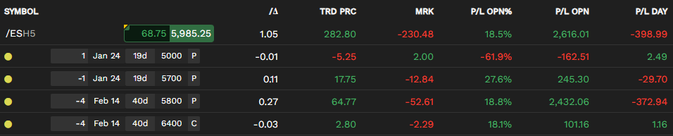 Currently, I’m up 1.6% and the market is down .7%. One consideration I had while contemplating my give back in 2024 is that the higher my percentage gets, I should reduce exposure. So a hypothetical would be that I go full position until I hit 30%. If it never gets to that, so be it, but if it does happen, I reduce positions by a percentage. In my current case, that would be removing one contract. And then continuing that every 10%. I have been trading with 7 contracts, so that would get me up to 80%. Odds are I wouldn't remove a contract at every 10% because it would be a lot of BP allocated per trade. So chances are I wouldn't need ALL of that allocation, but not allocating enough is ALWAYS what kills you.