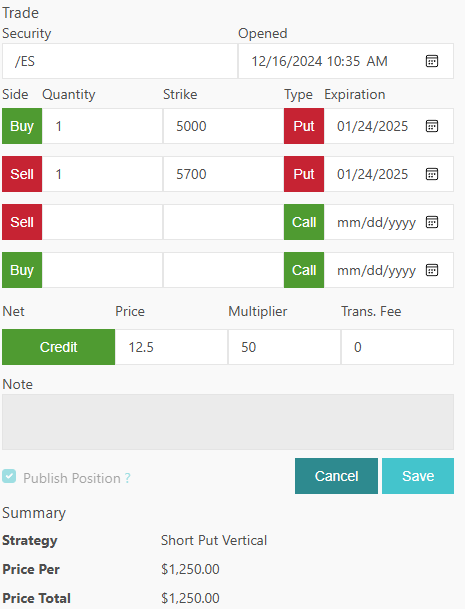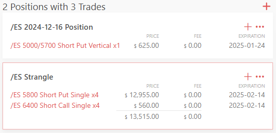 So let's get into the various buttons/links. Click in the + in the header row (beside the text `2 Positions with 3 Trades`) will present you with a form to create a new Position and Trade. If you click the + beside the position header (‘/ES Strangle’ as an example) it will NOT create a new Position, and only create a new trade. To see details and modify an existing trade, you can click on the trade title (ex. ‘/ES 6400 Short Call Single x4’). Clicking the 3 dots on a positions “card” will allow you to rename or delete a trade. Now let's walk through adding a new position/trade. We will click on the main + button.