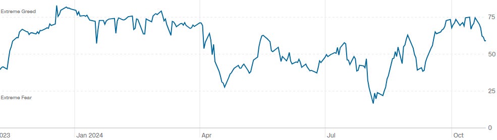 Nice move down. We are sitting at 59, which is just above neutral (55), in the greed area.