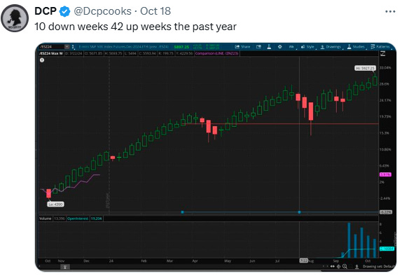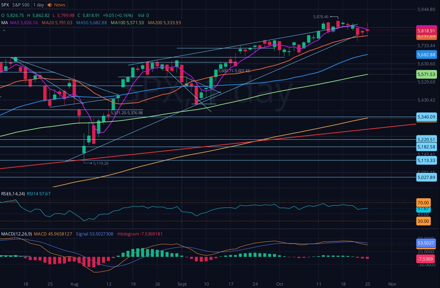 The market continues to be resilient, with only a small dip this week of .77%. While we technically have one more week of October, it’s unlikely that any real downside materializes. Some sources include the first week of November in this window, but even with two weeks, the lower end of what’s possible would be around the 50-day SMA around SPX 5680. That’s about a 2% drop from where we are. Big deal. With that knowledge, how do we proceed from here? We will talk that and more this week.