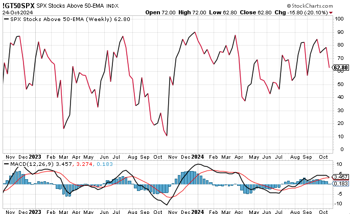 From 76.6 to 75.8 and now to 62.8, we are seeing a small dip in stocks above their 50 week ema. If it stops near here, it’ll be another higher low. It’s important to note that the market has held its position generally, while individual names rest. This provides more room to move higher in the coming months.