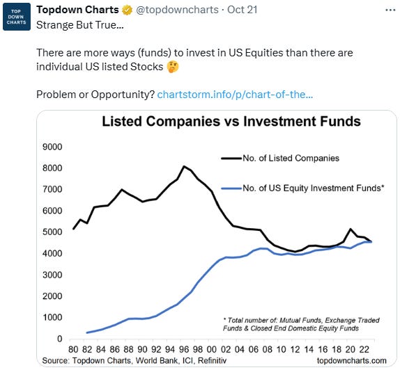 I just found this interesting. I covered in previous letters that more companies are choosing private funding (venture capital), so the number of publically traded companies is staying pretty static. Meanwhile, there are ETFs for every type of trader. Meme ETFs, if you will. Inverse Cramer, etc etc.