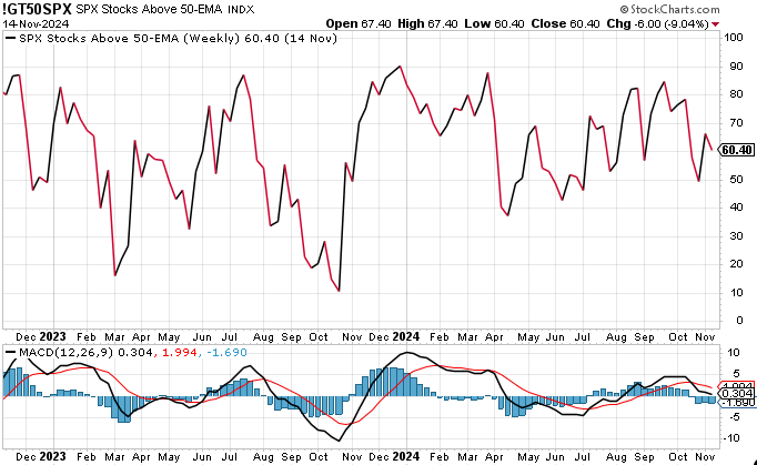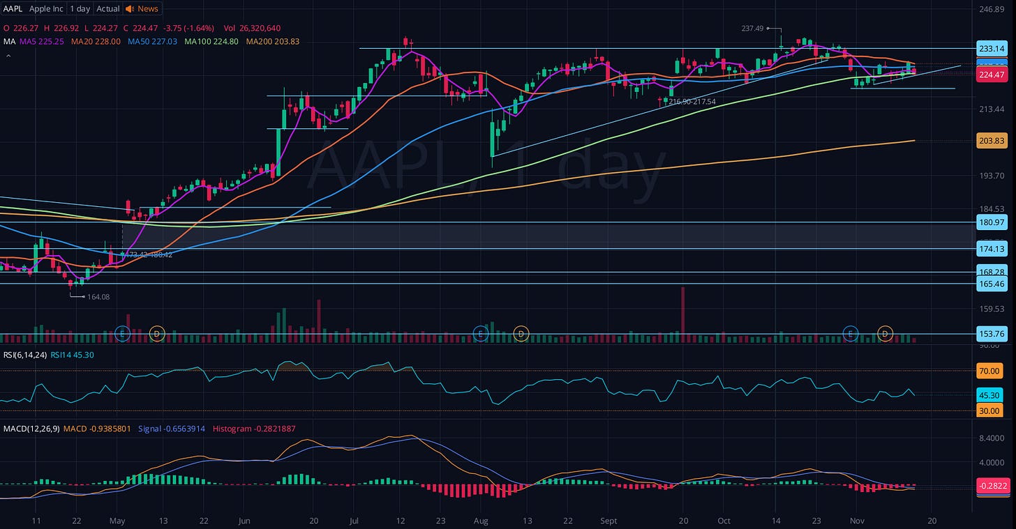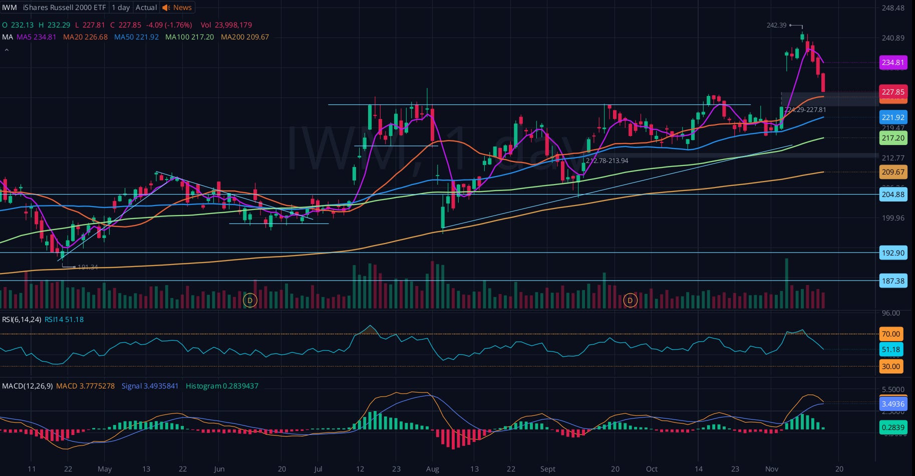 After being up nearly 5% last week, it’s no surprise that we chill out this week. I thought perhaps the move from the election would continue, as there are little headwinds, but the giveback basically started once trading began this week. At this point, we have come down to the 20-day simple moving average. Will buyers step in here? Or should we expect more downside?