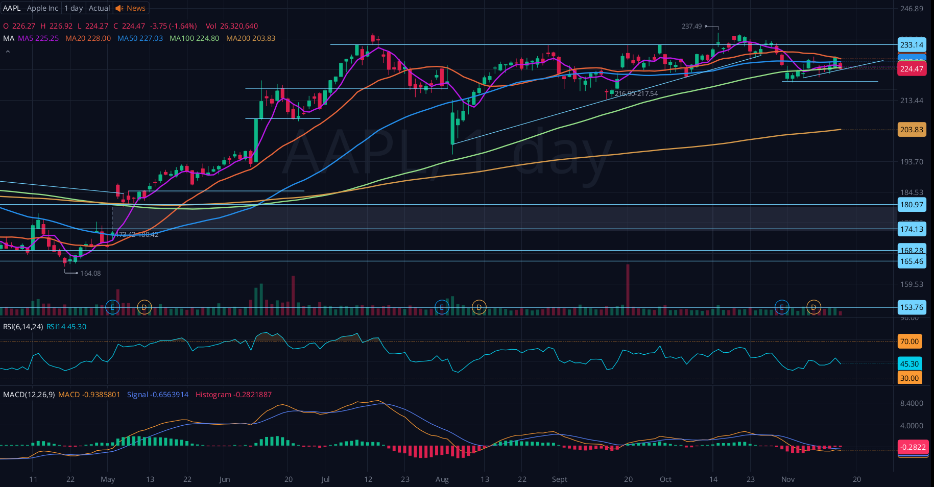 Giving back ALL the gains to confirm the break-out and possible fill the gap. It’s given up 4.27% this week. If it did fill the gap, it would be coming down to the 222 area. Unfortunate, but luckily, I wasn’t holding. I set an alert for 223 to reevaluate entering a position then.