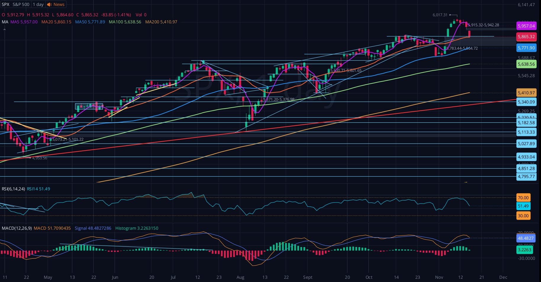 This week, SPX is down 2.15%. Macd hasn’t yet crossed below the 0 line, but with the significant drop on Friday, we likely overshoot the 20-day AT THE VERY LEAST. Sometimes we get a quick bounce back, but so far we aren’t making a convincing / typical bottom. This means there is likely more downside to come. While we are unmistakably in an uptrend, we are in a small bear countertrend at the moment. On the last dip, prior to the election, the 50-day SMA held as support. Coming down to fill the gap at 5783 may be logical. I don’t see much downside below that. The economy is strong, and the seasonality is strong.