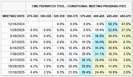 Lat week, I said that the events of this week should firm up these probabilities. I wouldn’t say that’s come to pass, but the probability of NO cut is up from 35% to 42% for December. The cut mid 2025 also moved from July back to September. Clearly things need to solidify more in the next month. I suspect the increase in no cut is just because we are dipping. Once the bull market resumes next week, odds will increase for the 25 point cut.
