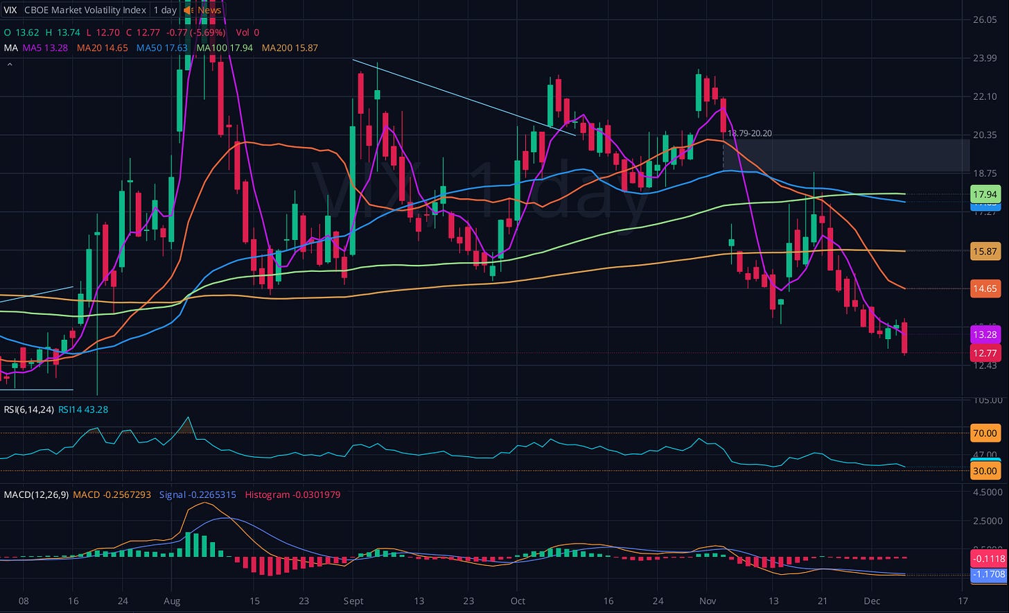 Vix down 5.5%. $12 is the lows for the year, so we are sitting just above that. We likely hit it this week.