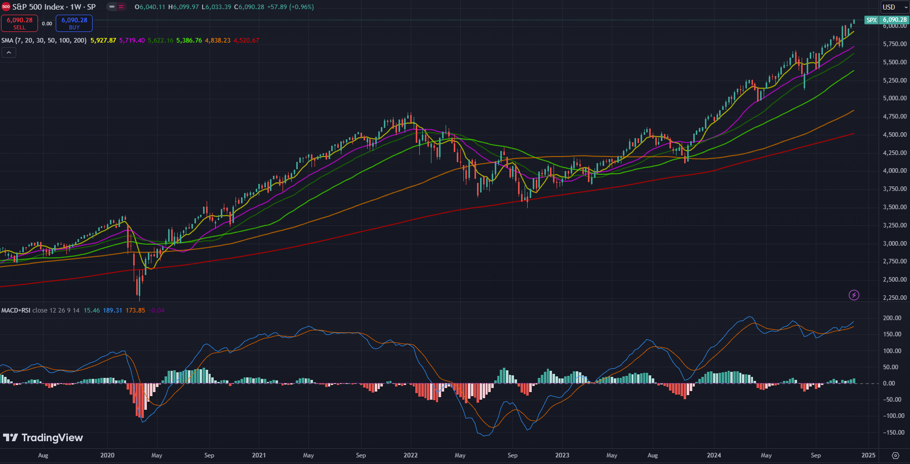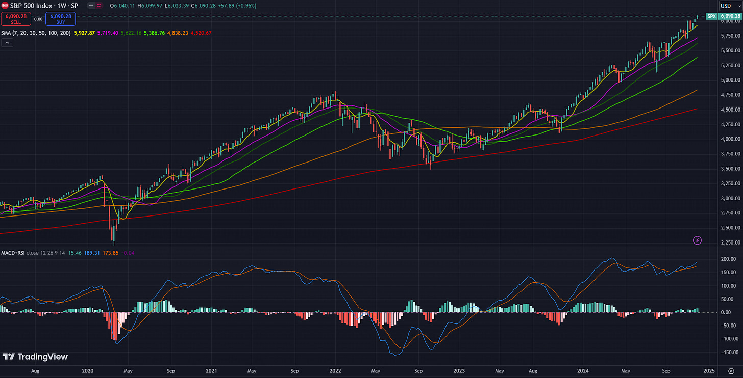 Perspective. Here is SPX since late 2019. This chart includes the COVID-19 crash and the 2022 bear market. Since then, it’s been pretty clear sailing. The hardest patch since 2022 was Aug-Nov 2023, when it dropped close to 11%. As posted last week, we typically have a 10% drop every other year, so this gives us some pause for next year. While I don’t believe we will drop 10% soon, if we were to start now that would take us down to about 5050.