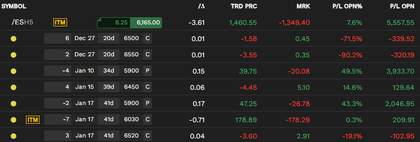 The market has already moved quite a bit. If we sort of have a blow off or exuberant run up, that may be conducive to a mini crash early next year. I would like to avoid that if possible. My base case is that we creep higher with a lot of chop because things have moved already recently, and overall this year. This is why I've been continuing to hold the calls and haven't thrown in the towel. A slow grind up, even if my strikes are in the money, is manageable. If we do quickly thrust up, then I will have to capitulate.