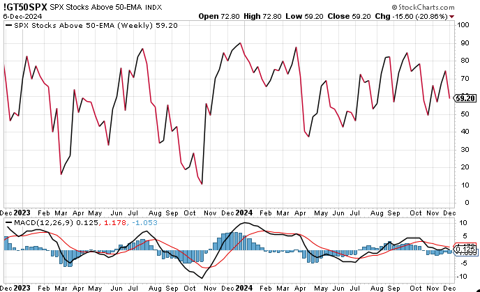Despite SPX being up around 1% stocks >50ema moved down from 72.6 to 59.2.