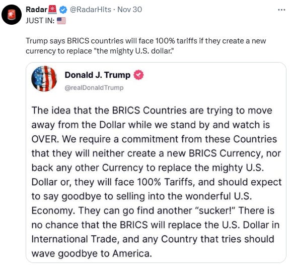 100% tariff is insane, and likely just a threat, but the interesting thing here is that BRICS is moving away from the dollar for exactly this reason. It’s an interesting strategy to force their hand to accomplish something they are trying to do anyway. Threats are only good if people think they are real AND don’t want them to happen. When BRICS moves away from the dollar, we will then be faced with whether a 100% tariff makes sense, which it doesn’t. So will be fascinating to see how this one pans out. Gotta sit back and just grab a popcorn.