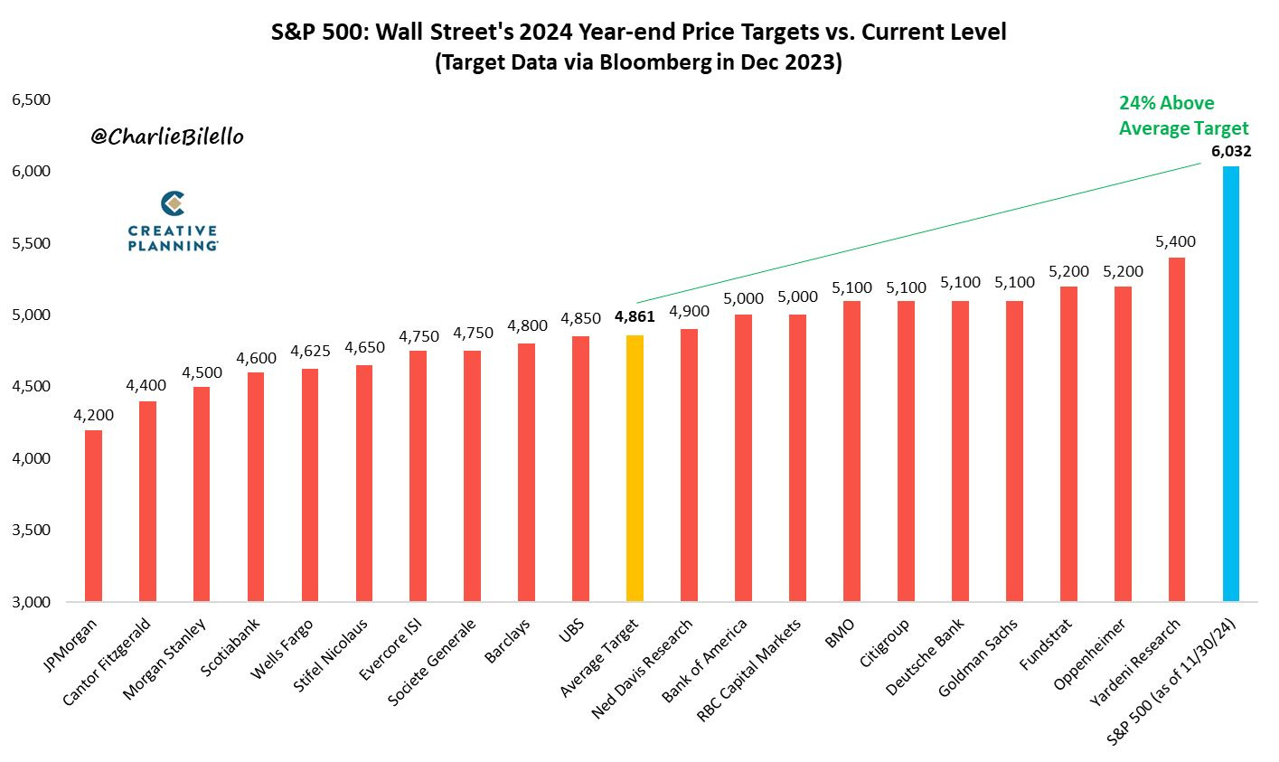 Wanted to end with this chart showing the expected 2024 returns by the analysts vs. actual. We opened at 4745, so a quarter of the targets were below the open price, meaning a negative year, and here we are up 28%. While I expect next year to be good, no one knows where the market is going.