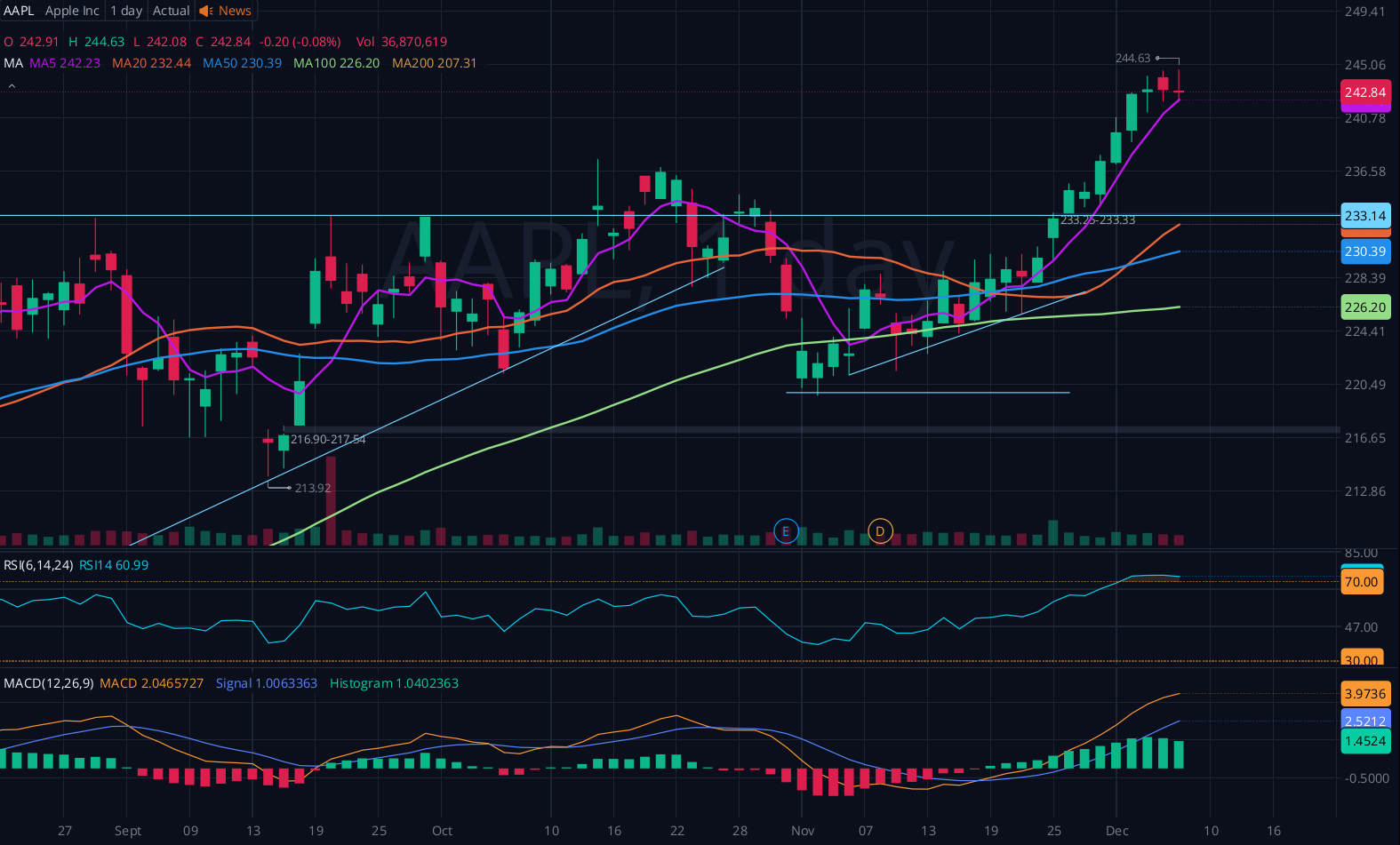 Apple is up 2.3% this week, after consolidating since July. The 236.80 level should act as good support going forward. At the moment, though, I'm not a buyer here. I would love to see a confirmation and go long then. Interestingly, it does look like momentum is waning, and so if it does fall, it will be a headwind for the market. Generally speaking, a lot of tickers I look at looks near the tops of their ranges. It was hard to find anything I really wanted to enter to end the week.