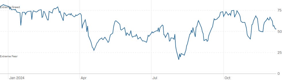 Decent drop this week from 73 to 53. We are back in neutral territory. The contrarian in me says we are coiling in November and December. We’ve been making higher lows, and avoiding highs. This seems like we will get that final push higher to over 75.