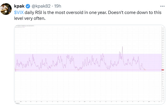 With the rise in SPX naturally, VIX is at lows. This is a two-year chart, including all of 2023 and 2024. You can see there has been plenty of volatility, and so we look set up well for some return to volatility in the new year.