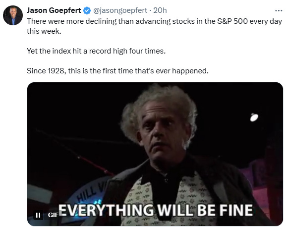 I almost think since the year has been so bullish that we end up skipping the Santa rally just to mess with everyone. Give back 6% into the end of the year, piss a lot of people off, and end the year just above 20% YTD. Maximum pain. But that's most likely just wishful thinking.