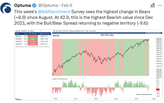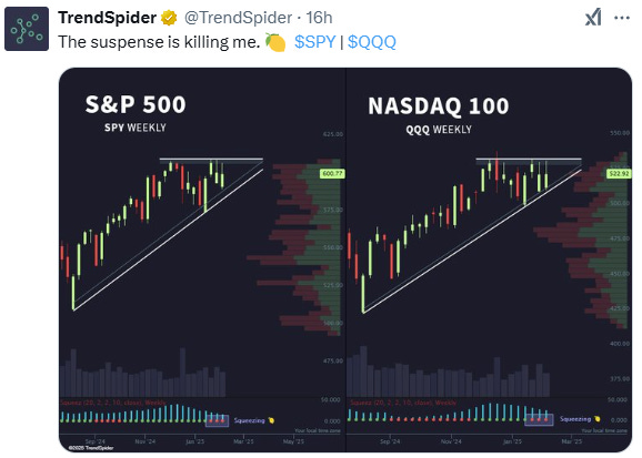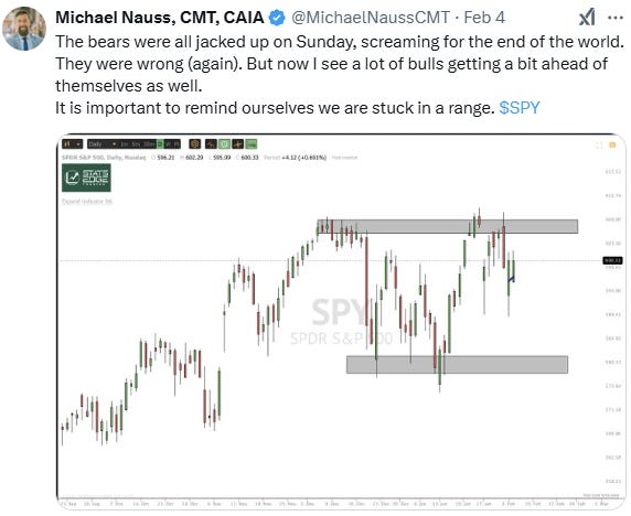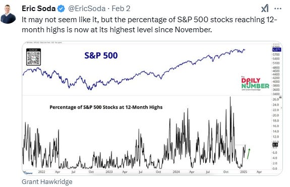We haven't made a new high for 16 days. It's 1.5% from the high. Intuitively, then you should know that the market is doing well. I don't read this as a bearish sign, it means the market remains strong. The specific gyrations of the week are just noise. Sometimes fewer data points on a chart tell a better picture. Zooming out, since 2023 it has been up and to the right.