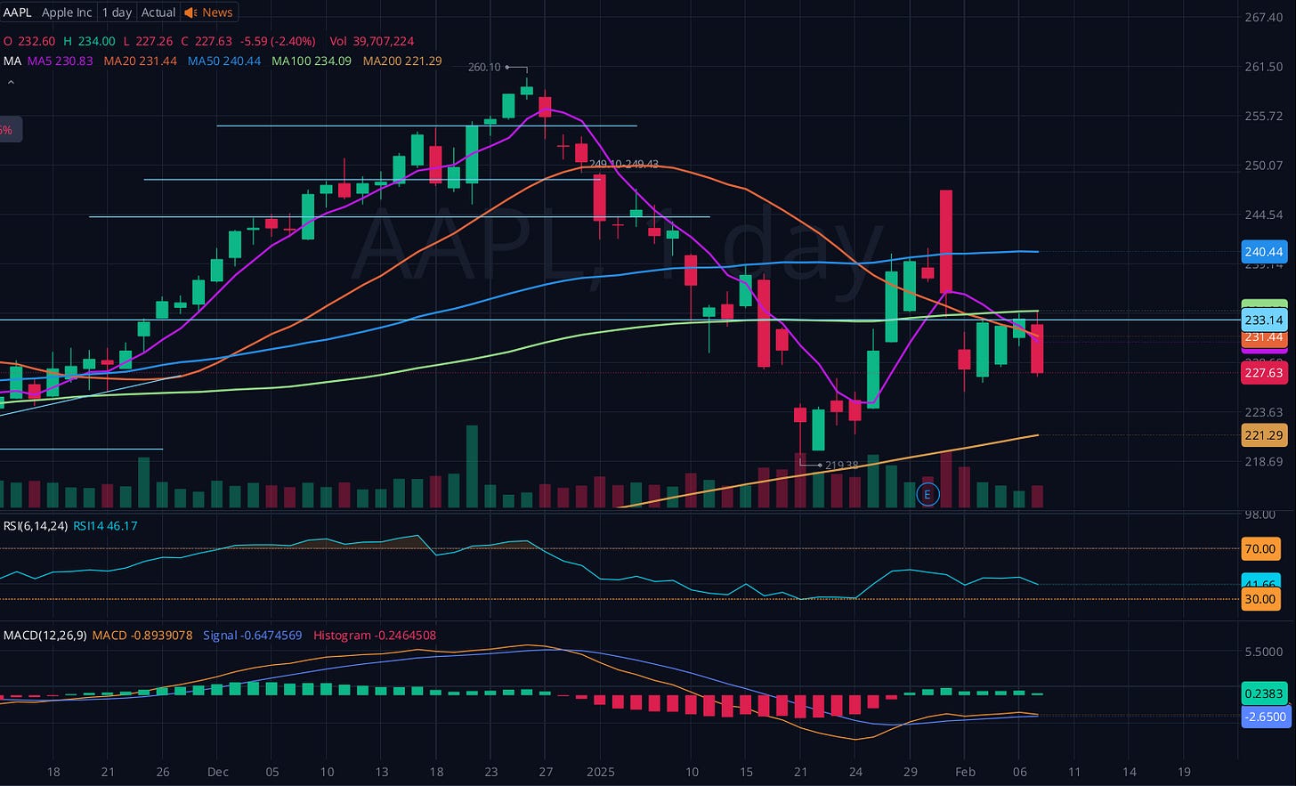 Apple staying on the struggle bus. This week we dropped below the 100d and traded in a range there. If we can make it back down to the 200d, I'm a buyer and would look to enter again. Until then, let it cook.