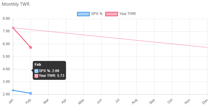I hit a new high of 9.19% YTD, but then the action Friday brought my account to 5.73%. Still, I'm easily beating SPX which is sitting at 2.09%. Beating SPX is my primary goal, so as long as I can stay above it, I'm happy.