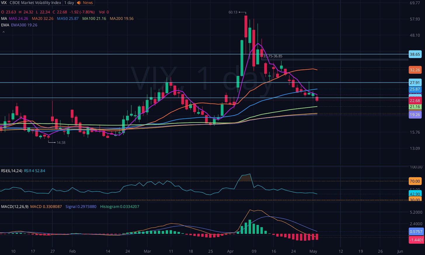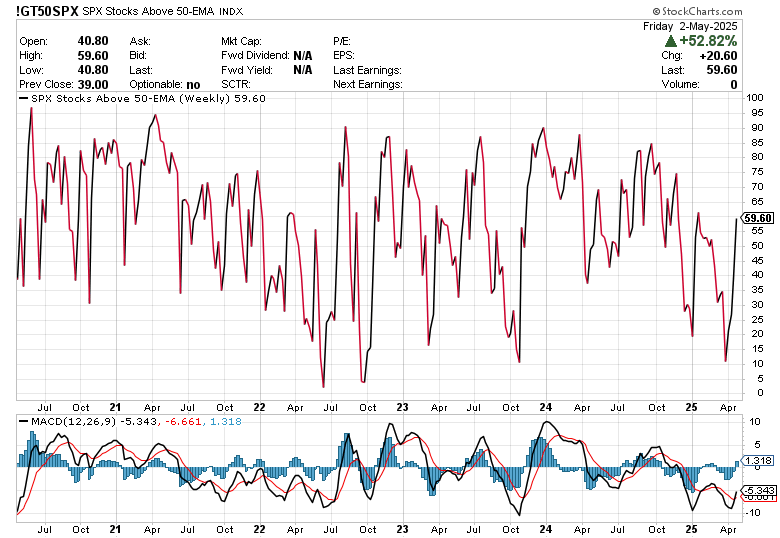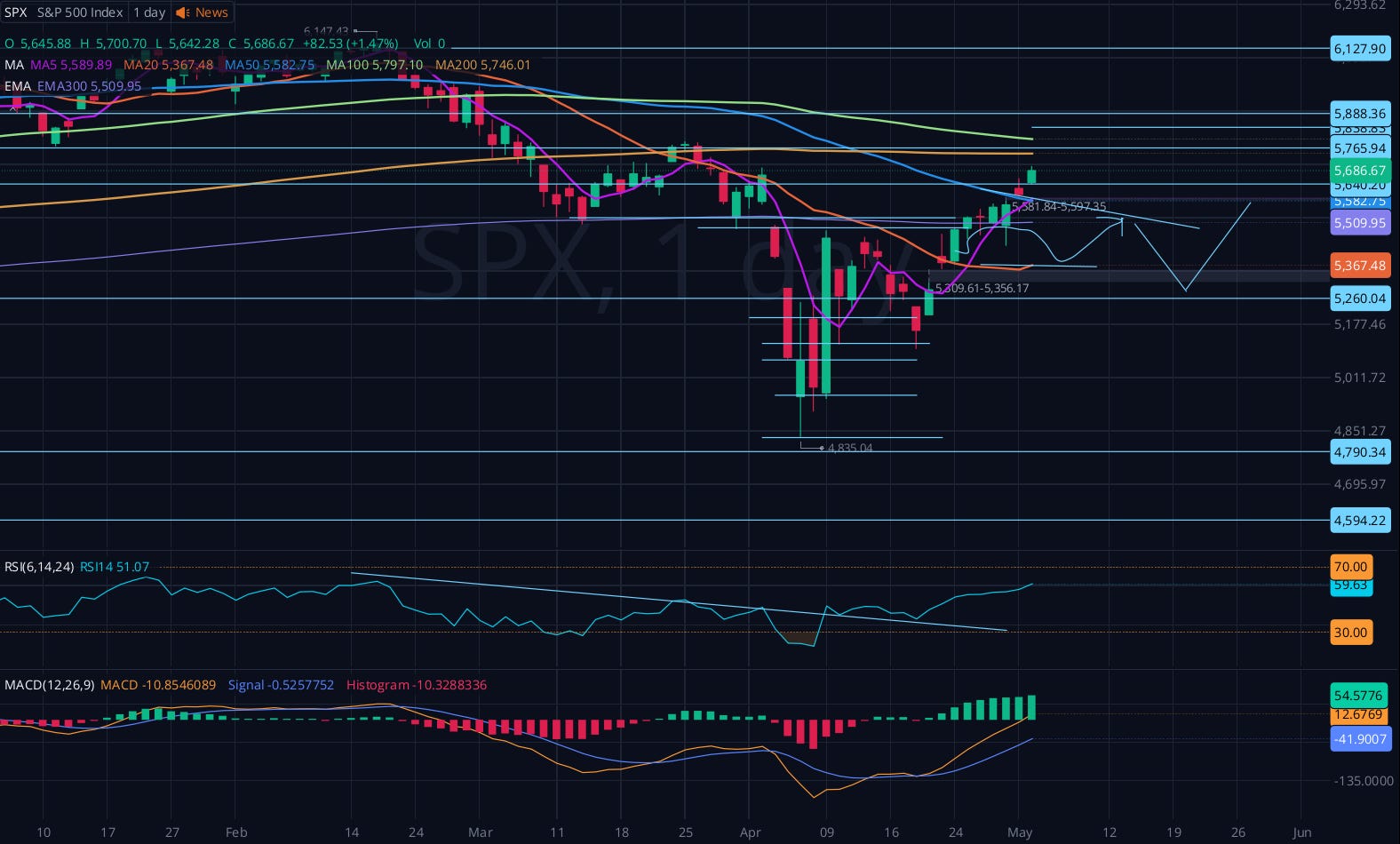You can see from my doodles that I anticipated the market checking the 20 day sma again, then failing to surpass the 50 day on its first attempt. Then a breakdown below the 20 which could be a bear trap, and then overcoming the 50d. I got the first part right, but then on Thursday it popped over the 50 day, and continued its rally on Friday. We are still below 2 final smas, the 100 and the 200. In theory, those would be the strongest supports, and thus the strongest resistance. The 100 day is clearly pointed down, while the 200 is still flat. We are up nearly 3% this week, overcoming the 10% drop from Liberation Day, when all the tariffs were announced. While 10% is a bit extreme, I’m definitely surprised that we are fully recovered. This is especially surprising because nothing has been settled. It’s possible we cannot overtake the last two smas, and we come down to test one of the supports again. To allow macd to cool off, but it could easily pop above and then rest.