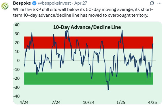 Last Sunday Bespoke discussed how the 10d was overbought, with it moving up 3% this week I’d imagine it’s only moved more overbought.